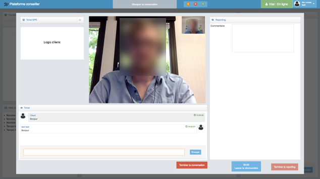 L’appel :Cet écran contient une partie tchat opérateur, lorsqu’il est fermé le logo du client apparaît, la webcam se trouve dans la partie centrale et en dessous une zone de tchat avec le client est présente. La dernière zone est paramétrable, il s’agit d’une zone de "reporting", ces informations seront enregistrées et liées à l’appel. Les champs et informations requis peut être modifié selon vos besoins. Les vidéos des deux webcams et le tchat peuvent être enregistrés pour être re visionnées plus tard.